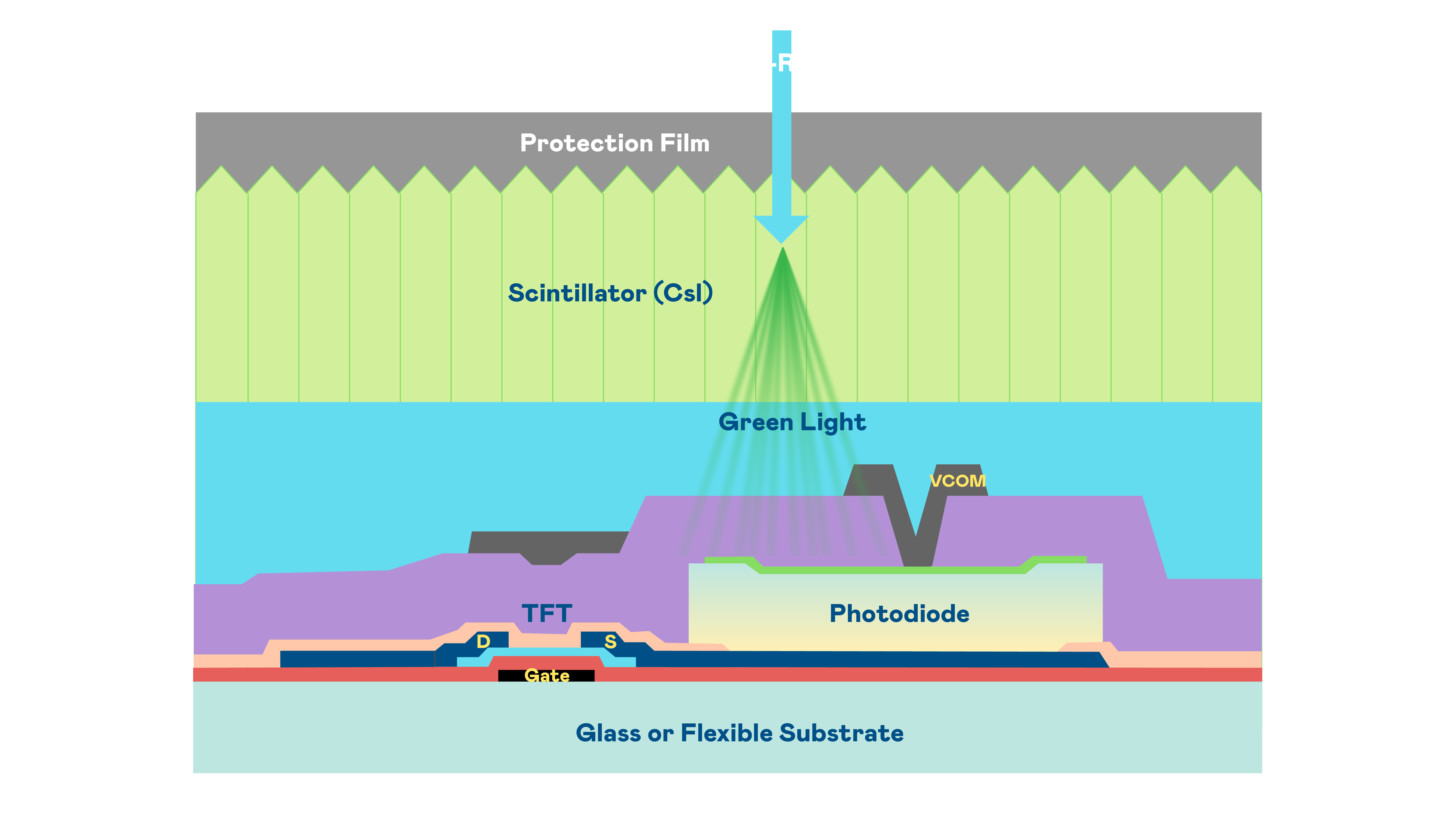 省港流鸢粤语高清的X光影像感測陣列使用薄膜電晶體 (TFT) 作為每個像素的讀取開關,搭配光電二極體(Photodiode)的光電轉換元件,用以感測X光影像訊號。